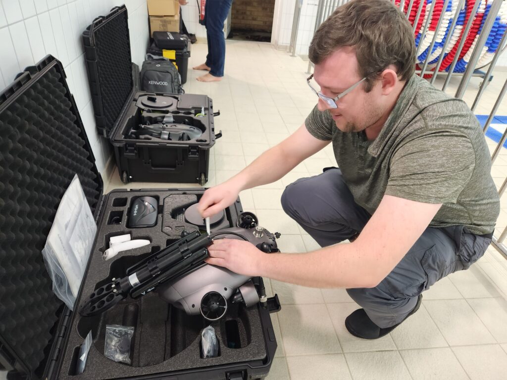 Launching of the units was straightforward using the rear handle and tether. As we had divers in the pool as well as ROVs one of the team was on tether duty, ready to reel in any robots that strayed too close to the humans. We also noticed that the tether is slightly positively buoyant which made cable management a bit easier than negative (which our other unit has).